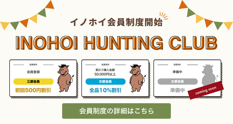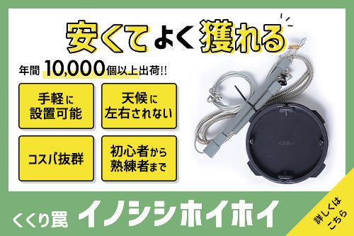 くくり罠の販売ページです。跳ね上げ式タイプを中心に、初心者からベテランの方まで多くご支持いただいています。届いてすぐに仕掛けられる完成品から、1個単位で購入できるばら売りパーツまで対応しています。日本全国配送可能、合計金額22,000円以上お買い上げで送料無料となります。 くくり罠を商品タイプ別で選ぶ それぞれのお客様のニーズに応じた各種くくり罠関連商品を取り揃えております。状況に合わせてお選びください。 完成品セット くくり罠を仕掛けるために必要なセットが揃った完成品です。組立済みですので工具も不要、届いてすぐに仕掛けることができます。詳しくはこちら>> 踏み板&台座セット スプリング・ワイヤー部分をご自身で用意される方にはこちらがお勧め。仕掛けやすくお値段もお手頃な踏み板を販売しています。詳しくはこちら>> 各種パーツ くくり罠の交換パーツ・部品単体をお探しの方に。必須となるワイヤーロープやサルカンなど、各部品を1個単位から購入可能。詳しくはこちら>> イノホイくくり罠の使い方と特徴 イノホイのくくり罠は、官公庁や自治体・猟友会の皆様に多くご愛顧いただいております。使い方や人気商品を以下でご紹介しておりますので、ご覧ください。 くくり罠の仕掛け方...