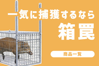 イノシシ対策品の通販販売ページです。捕獲用の箱罠・くくり罠をはじめ、狩猟お役立ち品、獣害に対処するための撃退・防除グッズなど、様々な商品を取り揃えております。 イノシシ対策の種類から選ぶ 箱罠で捕獲 身体能力や学習能力が高いイノシシの捕獲に適した実績多数の箱罠です。もっと詳しく>> くくり罠で捕獲 初心者からベテランまで。安くて高捕獲率と好評のくくり罠です。もっと詳しく>> 撃退・防除グッズ イノシシが忌避する習性を生かして撃退・防除するためのグッズです。もっと詳しく>> イノシシ対策品は、他にもいろいろ。 止め刺し トレイルカメラ(罠の監視) イノシシ侵入防止床...