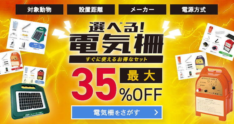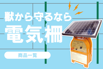 電気柵の販売ページです。動物が電線に触れた際に電気ショックを与える仕組みになっており、恐怖心を植え付けることで忌避させます。物理的な防御対策と併用すると、さらに効果的です。 また、電気柵とネット/フェンスがセットになった商品もございます。複合柵(電気柵+フェンス/ネット)。状況に応じてお選びいただけます。 商品ラインナップ 電気柵 本体セット(本体+危険表示板+アース棒+高圧線+検電器) 電線(柵線)は別途お持ちで、本体(電源)をお探しの方に。ソーラーパネル有りのタイプも用意しています。もっと詳しく>> 電気柵 コンプリートセット(本体セット+支柱・電線セット一式) 電気柵の設置に必要な機材が一通りセットになっています。それぞれ単体ごとに購入するよりもお買い得です。もっと詳しく>> 電気柵部材 単体販売(電線・支柱・ゲートクリップ・ガイシなど) 電線や支柱など単体でお買い求めの方はこちらをどうぞ。設置する場所に合わせて選択いただけます。もっと詳しく>>...