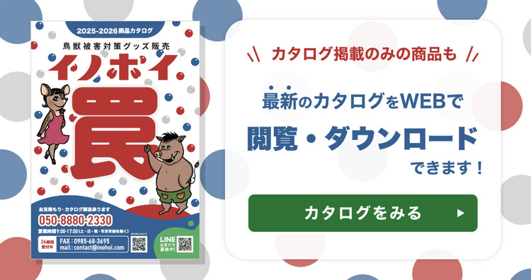 鳥獣被害を防ぐための防除・忌避グッズを取り揃えています。捕獲ではないので、狩猟免許が不要。鳥獣を物理的な寄せ付けない防除グッズから、鳥獣の習性を生かした忌避商品まで幅広く取り揃えています。防鳥対策品の特設コーナーはこちら。 商品タイプから選ぶ 音をつかって撃退 学習能力の高い鳥獣に対して効果のある商品を厳選しております。近隣環境や設置場所に合わせて音の調整が可能。単発の威嚇音ではすぐに慣れてしまう場合でも、被害を防ぎます。 もっと詳しく>> 物理的に侵入防止 最も一般的な防御方法。物理的に防ぐため、高い効果を発揮します。イノシシをはじめとした野生獣の防護柵から、野良猫侵入防止の剣山まで幅広く用意しています。 もっと詳しく>> 匂い・習性で撃退 臭いによる忌避や習性を生かして、強力な撃退効果を発揮します。設置がとても簡単で、人にも環境にもやさしい商品なので、安心して使用できます。各種補助金の対象にもなります。