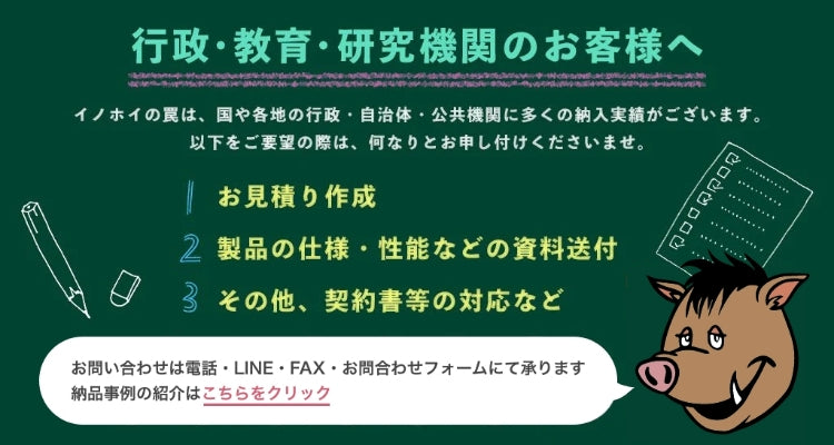イノホイの箱罠・くくり罠は、狩猟・有害駆除の現場にて「安くてよく獲れる」と、多くの好評をいただいております。シリーズ通算納品実績1万台超えのファーレ旭式箱罠、年間数千枚納品のくくり罠、ともに初心者からベテランまで多くのお客様にご愛顧いただいております。