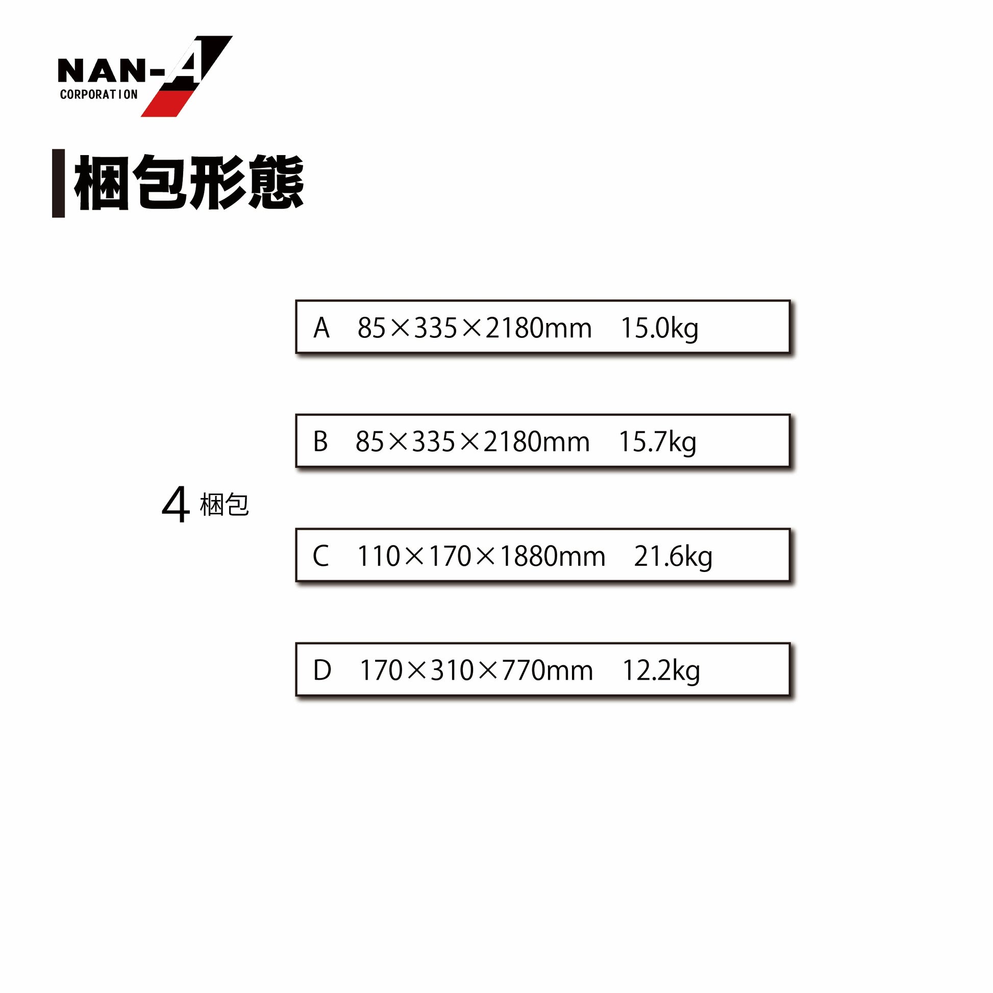 梱包サイズ 4梱包 A1ケース W:335 × L:2180 × H:85mm / 15.0kg A2ケース W:335 × L:2180 × H:85mm / 15.7kg Bケース W:170 × L:1880 × H:110mm / 21.6kg Cケース W:310 × L:770 × H:170mm / 12.2kg