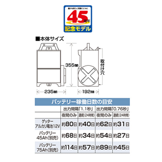 | 本体付属品 | ゲッターアルカリ電池12V、マイナス棒30型、バッテリーコード、注意表示板、本器取付ネジ(2本)、取扱説明書、保証書/登録カード |