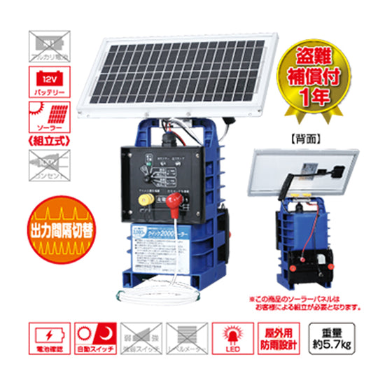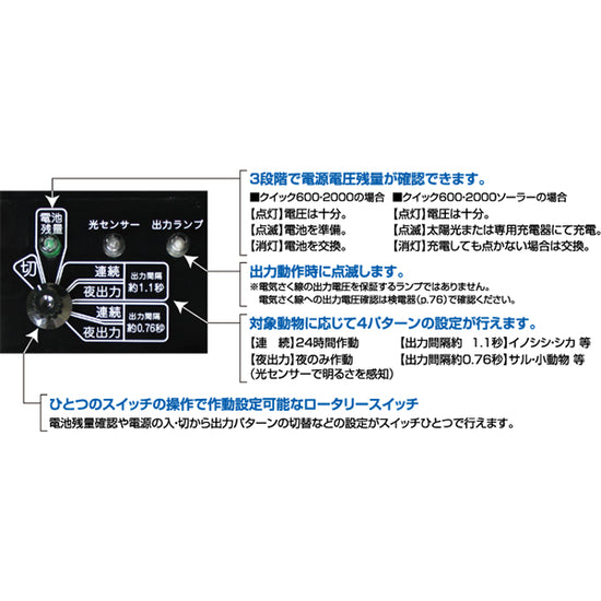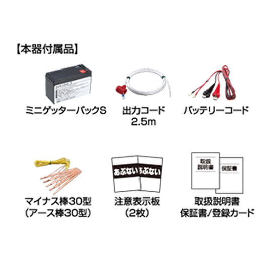 | 本体付属品 | ミニゲッターパックS、ソーラーパネル、ソーラー取付金具、丸形ナット(4個)、黒チューブ、マイナス棒30型、バッテリーコード、注意表示板、本器取付ネジ(2本)、取扱説明書、保証書/登録カード |