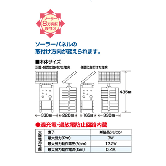 | 本体寸法 | ソーラーパネルを正面・背面に取付けた場合(約)たて435×よこ330×奥行220mm/ソーラーパネルを側面に取付けた場合(約)たて435×よこ165×奥行330mm |
