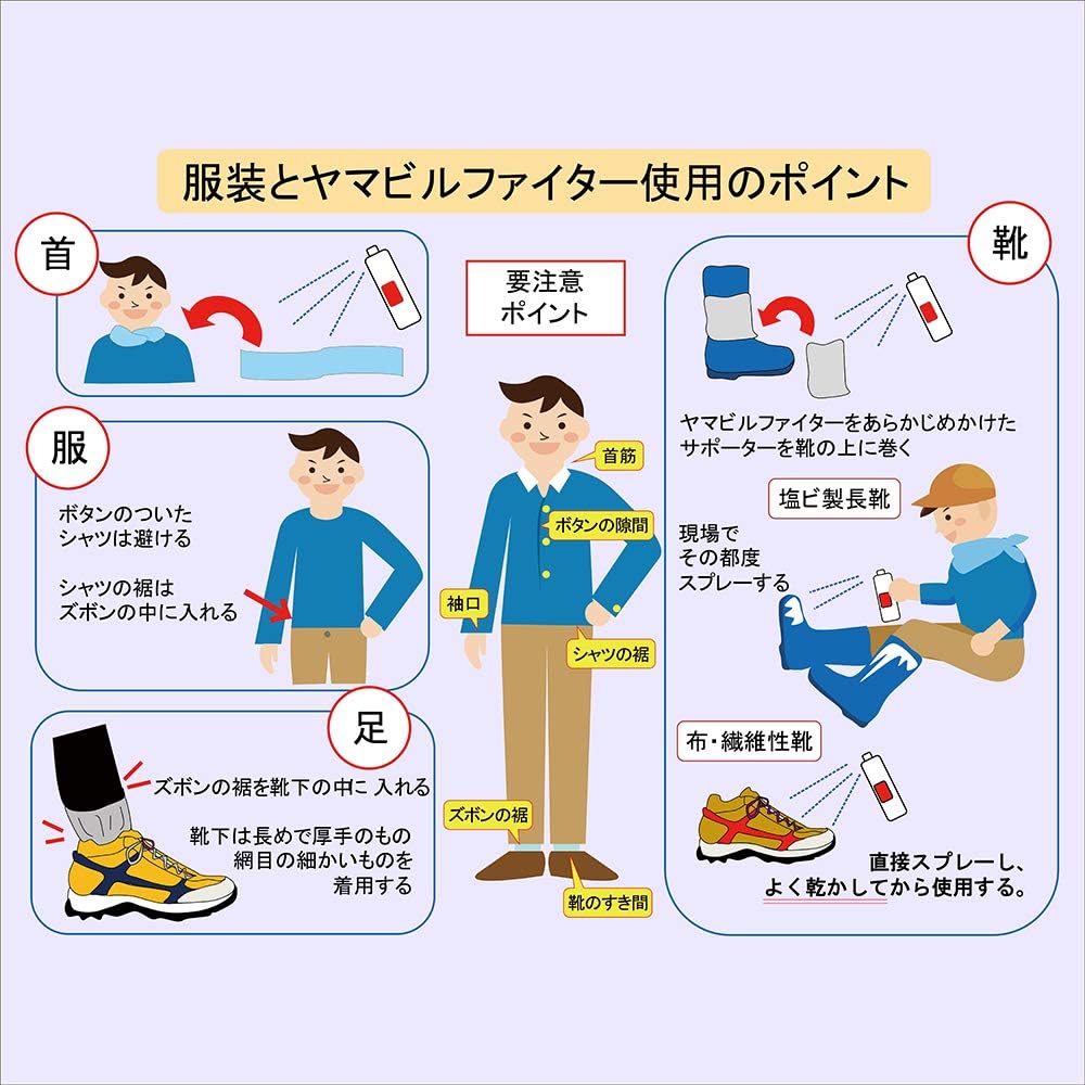 靴・ズボン・サポーター・腕カバーなど、ヒルが侵入しやすい部分に表面が濡れる程度に吹きかけます。